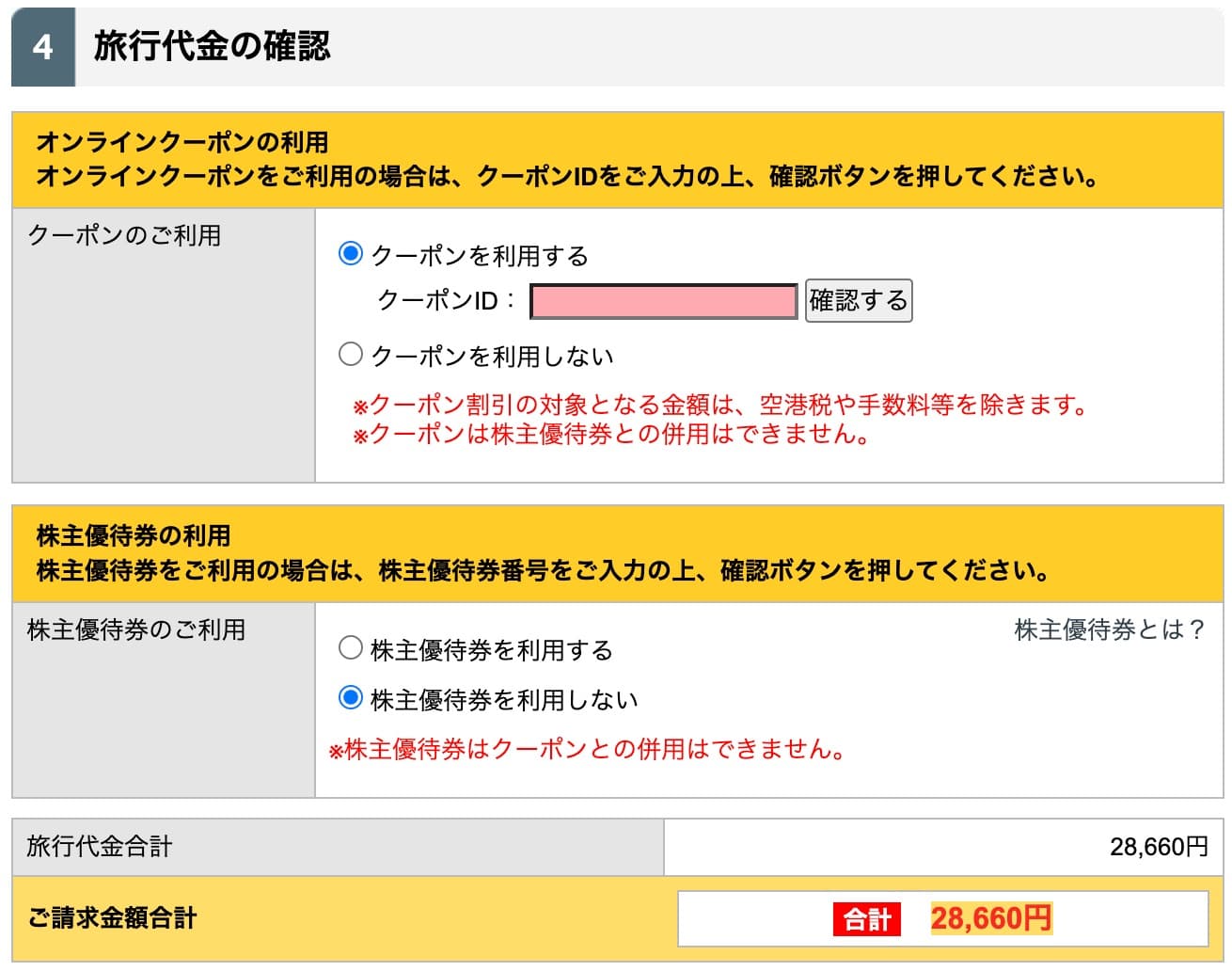 | クーポン適用金額 | 航空券代金(空港税など諸税や手数料を除いた金額)の総額が10,000円以上の予約 (シンガポール航空、JAL、ANAは対象外) |